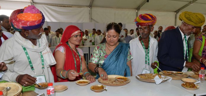 जयपुर। मुख्यमंत्री वसुन्धरा राजे ने सीतापुरा स्थित जयपुर एग्जीबिशन एवं कन्वेंशन सेंटर में चल रहे ग्राम 2016 में उद्यानिकी विभाग द्वारा आयोजित जाजम चैपाल में किसानों से रूबरू हुई। उन्होंने किसानों से कहा कि वे प्रतिस्पर्धात्मक खेती की ओर बढ़ें। साथ ही ऐसी फसलों का उत्पादन करें जो कम पानी में तैयार हों और जिन्हें जंगली सुअर, नील गाय आदि जानवर नुकसान नहीं पहुंचाते हों। मुख्यमंत्री ने किसानों के सुझाव सुनकर उन्हें उन्नत खेती के लिए भी प्रेरित किया। चैपाल में जब कृषि विषेषज्ञों ने बताया कि फ सलों में परागण मधुमक्खियों द्वारा होता है, लेकिन पिछले दो दशकों में कीटनाशकों के अत्यधिक एवं असमय प्रयोग के कारण प्राकृतिक मधुमक्खियों की संख्या में लगभग 30 प्रतिशत की कमी आई है। इस पर राजे ने कहा कि मधुमक्खियां किसानों की हितैषी हैं। किसानों को प्राकृतिक मधुमक्खियों की सुरक्षा करनी चाहिए। उन्होंने बताया कि मधुमक्खियों से प्राप्त रॉयल जैली बहुमूल्य होती है। इसी दौरान धौलपुर के नवयुवक खुशीराम ने बताया कि इस रॉयल जैली की कीमत बाजार में करीब दो लाख रूपये प्रति किलो तक है।