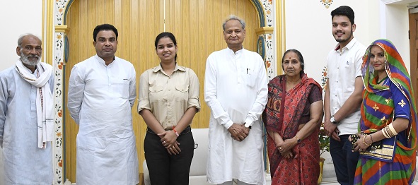 जयपुर। मुख्यमंत्री अशोक गहलोत से बुधवार को मुख्यमंत्री निवास पर धौलपुर की बहादुर युवती वसुन्धरा चौहान ने अपने परिवार के साथ मुलाकात की और पुलिस उप निरीक्षक पद पर नियुक्ति का अवसर देने के लिए मुख्यमंत्री का आभार व्यक्त किया।