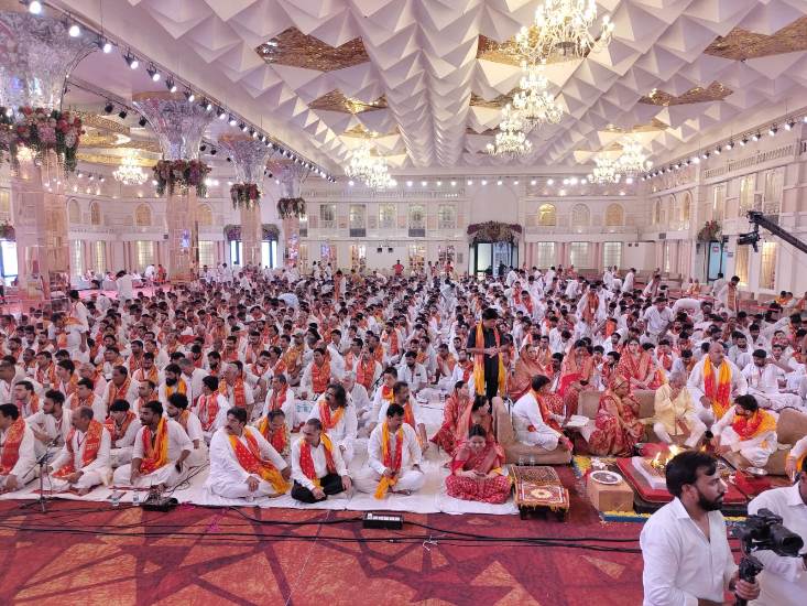जयपुर. एंटरटेनमेंट पैराडाइज (ईपी) में बड़े ही अनूठे और भव्य धार्मिक अनुष्ठान का आयोजन हुआ। इसमें देश के अलग-अलग हिस्सों से आए 1008 पंडितों ने एक साथ एक लाख 8 हजार हनुमान चालीसा का पाठ किया। इसके साथ एक ही छत के नीचे वेद मंत्रोच्चारण और 1008 बार सुंदरकांड का पाठ किया गया। आयोजकों का दावा है कि इस भव्य आयोजन को गोल्डन बुक ऑफ वर्ल्ड रिकॉर्ड में दर्ज किया गया है। कार्यक्रम के आयोजक जेकेजे ज्वेलर्स ग्रुप के डायरेक्टर जतीन मौसूण ने बताया इस आयोजन में राजस्थान समेत देश के कई अलग-अलग भाषाओं के विद्वानों ने 1008 पंडितों के साथ 7 घंटे में एक लाख 8 हजार हनुमान चालीसा का पाठ किया। इसके साथ ही जेकेजे ग्रुप का नाम गोल्डन बुक ऑफ़ वर्ल्ड रिकॉर्ड में दर्ज कराया है। यह आयोजन जेकेजे ग्रुप के संस्थापक श्याम सुन्दर मौसूण के 70वें जन्मदिवस के अवसर पर किया गया। इसमें सुबह 11 बजे से सुंदरकांड का पाठ शुरू किया गया। उसके बाद हनुमान चालीसा का पाठ किया गया। इसके लिए 80 फीट के मंच पर भगवान राम का दरबार सजाया गया। साथ में भगवान गणेश को एक-एक किलो के 70 लड्डूओं का भोग भी लगाया गया। अनुष्ठान के दौरान दिनभर परिवार के सदस्यों ने हवन कुंड में एक लाख 8 हजार बार आहूतियां डाली। आयोजक जतीन ने बताया- मेरे दादाजी पिछले 5 साल से प्रतिदिन 108 बार हनुमान चालीसा का पाठ करते आ रहे हैं। इसे ही देखते हुए दादाजी को उनके 70वें जन्मदिवस पर यह खास और अनूठा आयोजन करने का आइडिया आया। फिर देश के अलग-अलग पंडितों से संपर्क कर उन्हें कार्यक्रम के लिए आमंत्रित किया। जेकेजे ग्रुप के संस्थापक श्याम सुन्दर मौसूण ने बताया मेरी पत्नी की तबीयत आज से 5 साल पहले खराब हो गई थी। कई डॉक्टरों से इलाज कराया, लेकिन कोई फायदा नहीं मिल रहा था। ऐसे में मेरी हनुमान जी पर बहुत आस्था है। इस पर मैंने उसी दिन प्रण किया की हनुमान चालीसा का अब प्रतिदिन पाठ करूंगा। इससे धीरे-धीरे वह स्वस्थ हो गई। तब से लगातार प्रतिदिन मैं 108 बार हनुमान चालीसा का पाठ करता आ रहा हूं। पोते जतीन ने मेरे जन्म दिवस पर बहुत ही अनूठा उपहार दिया है।