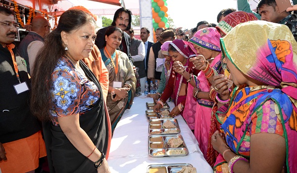 मुख्यमंत्री वसुन्धरा राजे ने फतेहपुर पहुंचकर 10 अन्नपूर्णा रसोई वैन रवाना की। यह वैन शहरी क्षेत्रों में नियमित रूप से खड़ी की जाएगी। जहां जरूरतमंदों को 5 रूपए में नाष्ता और 8-8 रूपए में सुबह-शाम का भोजन उपलब्ध होगा। इससे पहले उन्होंने मंदिर परिसर में बेटी बचाओ बेटी पढ़ाओ ब्रांड एम्बेसडर्स से मुलाकात की और पांच जननियों को बेबी गिफ्ट किट वितरित किए। राजे ने जनसंवाद कार्यक्रम में जाट, मुस्लिम, एससी, एसएसटी, ओबीसी, राजपूत, वैश्य, अग्रवाल, जैन सहित विभिन्न समाज के लोगों से संवाद किया। इस अवसर पर देवस्थान राज्यमंत्री राजकुमार रिणवां, सांसद संतोष अहलावत, विधायक अभिषेक मटोरिया, संभागीय आयुक्त राजेश्वर सिंह, प्रमुख शासन सचिव स्वायत शासन मंजीत सिंह, आईजी हेमन्त प्रियदर्शी, सीकर जिला कलेक्टर नरेश कुमार ठकराल एवं अन्य अधिकारी उपस्थित थे।