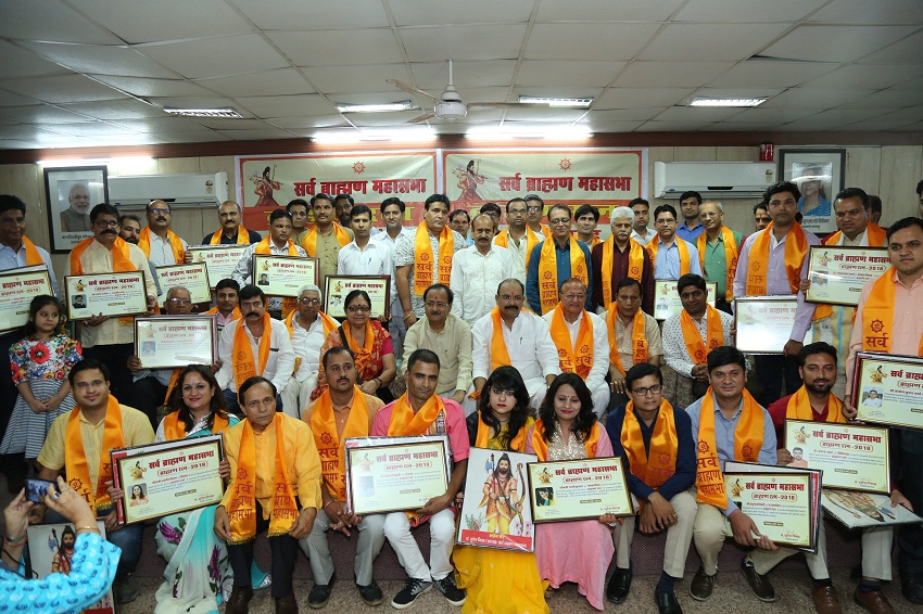 जयपुर। ब्राह्मणों को अपने संस्कारों को प्रबल करते हुए समाज को दिशा एवं मार्गदर्शन देना चाहिए। ब्राह्मण समाज ने सदैव परहित में कार्य किया है। ये विचार भगवान परशुराम जयंती समारोह के समापन के अवसर पर सर्व ब्राह्मण महासभा द्वारा आयोजित ब्राह्मण रत्न सम्मान समारोह में राजस्थान प्रदेश कांग्रेस कमेटी के पूर्व अध्यक्ष डॉ. बी.डी.कल्ला ने कहे। इस अवसर पर ब्राह्मण रत्न सम्मान में 41 प्रतिभाएं सम्मानित की गई. समारोह की अध्यक्षता करते हुये सर्व ब्राह्मण महासभा के राष्ट्रीय अध्यक्ष पंडित सुरेश मिश्रा ने कहा कि ब्राह्मण सर्वहित की बात करता है और सर्वजन सुखाय की भावना से समाज को एक राह दिखाता है। मिश्रा ने 14 प्रतिशत आरक्षण ब्राह्मणों को मिले इसके लिये दबाव बनाने की बात कही तथा सभी ब्राह्मणों में एक स्वर में मिश्रा के साथ संघर्ष का एलान किया।