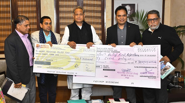 जयपुर। मुख्यमंत्री अशोक गहलोत को शुक्रवार को मुख्यमंत्री कार्यालय में राजस्थान बेवरेज कॉरपोरेशन लिमिटेड तथा गंगानगर शुगर मिल्स की ओर से 30-30 करोड़ रूपये के चैक मुख्यमंत्री सहायता कोष में भेंट किए गए।