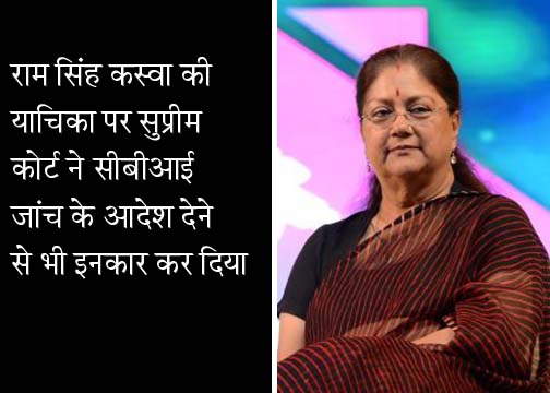 जयपुर। जयपुर के सुर्खियों में रहे खासाकोठी होटल से गायब हुए किमती कालीन के मामले में आज प्रदेश की मुख्यमंत्री वसुंधरा राजे को सुप्रीम कोर्ट से राहत मिल गई है। आज इस मामले में जस्टिस रंजन गोगोई और जस्टिस नवीन सिंहा की खण्डपीठ ने सुनवाई की। सुनवाई के दौरान राम सिंह कस्वा की याचिका को यह कहकर खारिज कर दिया की इस याचिका में मामले से सम्बन्धित पर्याप्त सबूत नहीं है। और कहा कि इस मामले में क्लोजर रिपोर्ट पहले ही दाखिल हो चुकी है। इसलिए नए आदेश जारी करने की जरूरत नहीं है और सुप्रीम कोर्ट केस दर्ज करने और सीबीआई जांच के आदेश देने से भी इनकार कर दिया है।