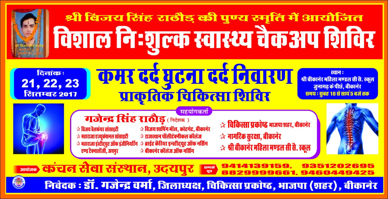 बीकानेर। विजय सिंह राठौड़ की पुण्यस्मृति में 21,22,23 सितम्बर को सवेरे 10 बजे से सांय 5 बजे तक जुनागढ़ के पीचे श्री बीकानेर महिला मण्डल सिनियर सैकेण्ड्री स्कूल में कंचन सेवा संस्थान उदयपुर को प्राकृतिक संसाधनों द्वारा एक विशाल नि:शुल्क स्वास्थ्य जांच एवं चिकित्सा शिविर का आयोजन किया जा रहा है। जिसमें विशेष रूप से घूटने एवं कमर दर्द से सम्बन्धित सभी प्रकार के रोगों का इलाज किया जाएगा। उपस्थित बच्चों का स्वास्थ्य परीक्षण भी होगा। आवश्यकता होने पर दवा नि:शुल्क दी जावेगी। नागरिक सूरक्षा चीफ वार्डन नवरतनमल दफ्तरी ने बताया की शिविर गजेन्द्र सिंह राठौड़ निदेशक विजय शॉपिंग मॉल, राजस्थान पोलोटेक्निक कॉलेज व बीकानेर कॉलेज आॅफ नर्सिंग के विशेष सौजन्य से किया जा रहा है।