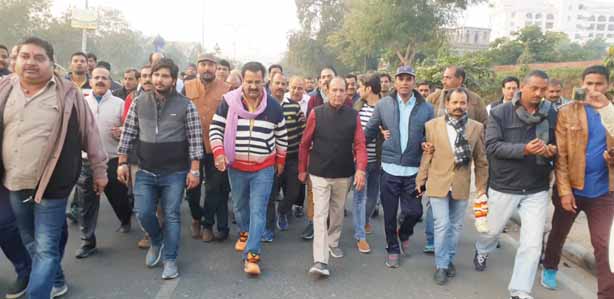 जयपुर । राजस्थान सरकार के केबिनेट मंत्री और जयपुर जिलाध्यक्ष प्रतापसिंह खाचरियावास आज अपने सिविल लाईन्स स्थित खाचरियावास हाउस से सुबह 6:15 बजे पैदल पदयात्रा करते हुये अपने समर्थकों के साथ आराध्य देव ठाकुरश्री गोविन्ददेव जी मंदिर पहुंचे। प्रतापसिंह खाचरियावास अपने परिवार और कांग्रेस परिवार के सदस्यों के साथ सिविल लाईन्स स्थित अपने घर से रवाना हुये तो समर्थकों द्वारा श्री कृष्ण गोविन्द हरे मुरारी-हे नाथ नारायण वासुदेवा, हरे कृष्णा हरे कृष्णा-कृष्णा कृष्णा हरे हरे, हरे राम हरे राम-राम राम हरे हरे, वन्दे मातरम्, जय सियाराम की आवाज से पूरा रास्ता गुंजायमान रहा, लोग भजन-कीर्तन करते हुये पदयात्रा कर रहे थे। सिविल लाईन्स, सी-स्कीम, सांगानेरी गेट, जौहरी बाजार, बडी चैपड़ पर कांग्रेस कार्यकतार्ओं और नागरिकों ने खाचरियावास का स्वागत किया। जगह-जगह से सैकडों लोग पदयात्रा में षामिल होते गये। इसके पश्चात 9:45 की झांकी में गोविन्द देव जी मंदिर पहुंचकर प्रतापसिंह खाचरियावास ने अपने पिता लक्ष्मण सिंह षेखावत और पत्नि नीरज कंवर, पुत्र आदित्य एवं कृष्णवर्धन, भांजा दुष्यन्तराज सिंह चूण्डावत और कांग्रेस परिवार के सैकडों कार्यकतार्ओं के साथ आराध्य देव श्री गोविन्ददेव जी के दर्षन कर पूजा-अर्चना की।