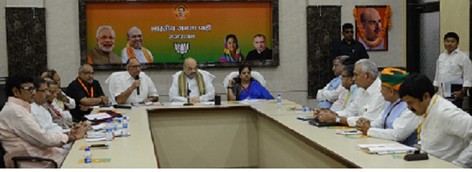 भाजपा के मीडिया सम्पर्क प्रमुख आनन्द शर्मा ने बताया कि कोर कमेटी की बैठक में राष्ट्रीय अध्यक्ष अमित शाह, मुख्यमंत्री वसुन्धरा राजे, राष्ट्रीय सह-संगठन महामंत्री वी. सतीश, राष्ट्रीय उपाध्यक्ष एवं प्रदेश प्रभारी अविनाश राय खन्ना, राष्ट्रीय उपाध्यक्ष ओमप्रकाश माथुर, प्रदेशाध्यक्ष अशोक परनामी, राष्ट्रीय महामंत्री भूपेन्द्र यादव, केन्द्रीय मंत्री सी.आर.चौधरी, अर्जुन मेघवाल, गृह मंत्री गुलाब चन्द कटारिया, ग्रामीण विकास एवं पंचायतीराज मंत्री राजेन्द्र राठौड़, सामाजिक न्याय एवं अधिकारिता मंत्री अरूण चतुर्वेदी मौजूद रहे। कोर कमेटी मीटिंग में संगठनात्मक मजबूती के एजेण्डे पर बातचीत हुई। अमित शाह ने सुबह पण्डि़त दीनदयाल उपाध्याय जन्म शताब्दी वर्ष प्रदेश समिति, विस्तारक कार्ययोजना प्रदेश समिति, एवं विस्तारक पालक (अभिभावक) की बैठक, दोपहर एक बजे बोर्ड, निगम/,आयोग के अध्यक्ष, नगर सुधार न्यास अध्यक्ष, महापौर, जिला प्रमुख, पंचायत समिति प्रधान व नगर निकाय अध्यक्षों से बैठक, दोपहर 3 बजे चुनाव प्रबन्धन-प्रदेश कोर कमेटी की बैठक की।