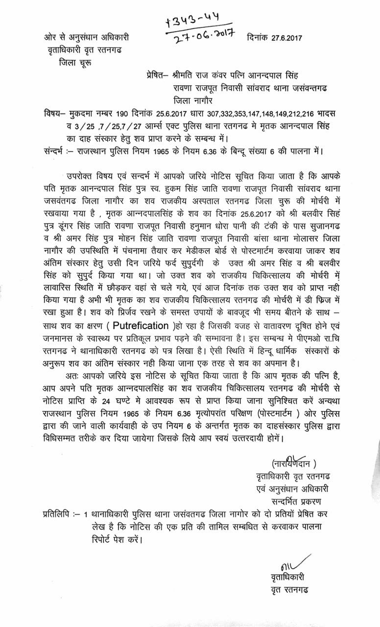 जयपुर। गैंगस्टर आनन्दपाल सिंह के शव को रतनगढ़ मोर्चरी में रखे हुए आज बुधवार को पांच दिन हो गए हैं। परिजन आनन्दपाल का शव तब लेने की कह रहे हैं, जब उनकी मांगों पर सरकार सहमति दे। उधर आनन्दपाल के शव का दाहसंस्कार नहीं होने से पूरे शेखावाटी क्षेत्र में तनाव है। हजारों लोग सावरदा, लाडनू, रतनगढ में डटे हुए हैं। कई क्षेत्रों में धरने-प्रदर्शन हो रहे हैं। आनन्दपाल के शव लेने के लिए पुलिस ने उनके परिजनों को नोटिस भेजा था। नोटिस नहीं लेने पर अब पुलिस ने उनके घर पर नोटिस चस्पा किया है। वे शव ले जाएं, नहीं तो पुलिस उसका अंतिम संस्कार करेंगी।
