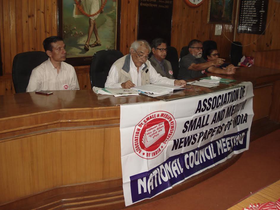 मसूरी | 4 जुलाई काे एसाेसिएशन ऑफ स्माल एण्ड मीडियम न्यूजपेपर्स आफ इण्डिया के राष्ट्रीय परिषद की बैठक नगर पालिका सभागार, मसूरी मैं सम्पन्न हुई |जिसमें उत्तराखण्ड, उत्तर प्रदेश, दिल्ली,पंजाब, मध्य प्रदेेश. राजस्थान, गुजरात, महाराष्ट्र, आन्ध्र प्रदेश, कर्नाटक, पश्चिम बंगाल व असम के प्रतिनिधियों ने भाग लिया। बैठक में सर्वप्रथम उत्तराखण्ड के पूर्व प्रदेश अध्यक्ष राजेन्द्र गैराेला, महाराष्ट्र के अध्यक्ष अप्पासाहेब पाटिल की पत्नी व उत्तराखण्ड के वरिष्ठ छायाकार कमल जाेशी के निधन पर शाेक व्यक्त करते हुये दाे मिनट का माैन रक्खा। उसके उपरान्त शिरड़ी सम्मेलन की रिपाेर्ट पटल पर रक्खी गयी।