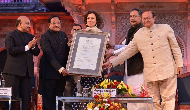 जयपुर। अपनी कलांं स्थापत्य और संस्कृति के लिए विश्व में एक खास पहचान रखने वाले गुलाबी नगर जयपुर के सम्मान में एक और सितारा तब जुड़ गया जब यूनेस्को ं की महानिदेशक श्रीमती ऑड्रे अजोले ने बुधवार को अलबर्ट हॉल पर आयोजित समारोह में स्वायत्त शासन एवं नगरीय विकास मंत्री श्री शांति धारीवाल को जयपुर का वल्र्ड हैरिटेज सिटी का प्रमाण पत्र प्रदान किया।
