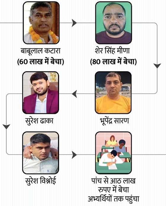 जयपुर. सीनियर टीचर भर्ती पेपर लीक मामले में स्पेशल ऑपरेशन ग्रुप (एसओजी) ने बुधवार को बड़ा खुलासा किया। राजस्थान लोक सेवा आयोग(आरपीएससी) के मेंबर बाबूलाल कटारा ने ही पेपर लीक किया था। कटारा ने वाइस प्रिंसिपल शेरसिंह मीणा को 60 लाख रुपए में पेपर बेचा। शेरसिंह ने 80 लाख रुपए में भूपेंद्र सारण को यह पेपर दिया। एसओजी अफसरों का दावा है कि मामले में फरार चल रहे सुरेश ढाका को भी जल्द ही अरेस्ट कर लिया जाएगा। एसओजी एडीजी अशोक राठौड़ ने बताया कि शुरुआती जांच में हम लोगों को पता चल गया था कि किसी परीक्षा केंद्र से पेपर लीक नहीं हुआ है। बल्कि आरपीएससी ये ही पेपर लीक हुआ था। इसके बाद इनपुट मिलने के आधार पर विशेष टीम का गठन कर कड़ी से कड़ी जोड़कर कार्रवाई को अंजाम दिया। आखिरी मोहरे तक हम लोग पहुंच सके। गिरफ्तार आरपीएससी के मेंबर बाबूलाल कटारा, उसके भांजे विजय डामोर और ड्राइवर गोपाल को आज कोर्ट में पेश किया गया। 29 अप्रैल तक रिमांड पर भेजा गया है। राठौड़ ने बताया कि पेपर सेट करने का जिम्मा बाबूलाल कटारा के पास था। कटारा ने पेपर शुरू होने से 2 हफ्ते पहले ही शेर सिंह को हाथ से लिखा पेपर दे दिया था। शेर सिंह ने दो किस्तों में 60 लाख रुपए कटारा को दिए। शेर सिंह ने इस पेपर को जयपुर के शास्त्री नगर थाना इलाके में टाइप करा कर भूपेंद्र सारण को बेच दिया। भूपेंद्र फिर इस पेपर को आगे सर्कुलेट करता चला गया। पेपर को 5 लाख रुपए तक में बेचा गया। एडीजी ने बताया कि जांच के दौरान पुलिस टीम ने हर जगह सर्च किया। परीक्षा केंद्र से लीक होने का कोई इनपुट नहीं मिला। इस पर आरपीएससी चेयरमैन से संपर्क किया गया। उन्हें कहा पेपर की चैन ऑफ कस्टडी देखी जाए। इससे पता चल सकेगा की किस-किस व्यक्ति के पास पेपर की एक्सेस था। राठौड़ ने बताया कि दिसंबर से लेकर अप्रैल तक हमारी टीम ने एक-एक कर इस गिरोह के सदस्यों को पकड़ना शुरू कर दिया। इस गिरोह के सदस्यों से हुई पूछताछ के बाद एसओजी को पता चल सका की आरपीएससी के सदस्य ने पेपर लीक किया है। जिस पर मंगलवार सुबह टीम को अजमेर भेजा गया। इसके बाद तीनों आरोपियों की गिरफ्तार हुई।