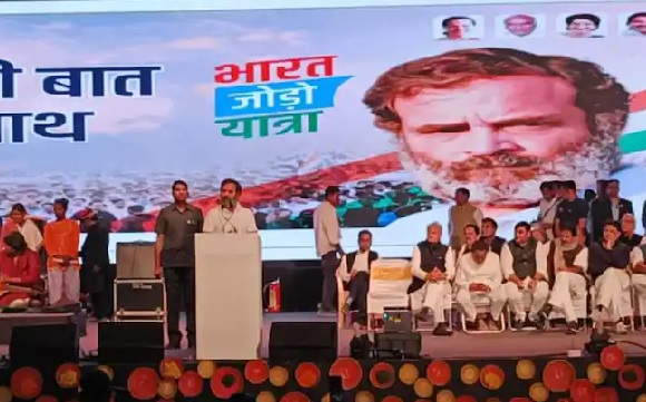 आयोजित समारोह में जोरदार स्वागत किया गया। राहुल गांधी ने सीएम अशोक गहलोत और पूर्व डिप्टी सीएम सचिन पायलट के साथ मंच पर कालबेलिया और सहरिया नृत्य कार्यक्रम के बीच डांस किया। इस मौके पर आयोजित कार्यक्रम में राहुल गांधी ने कहा कि कन्याकुमारी से ये यात्रा शुरू की गई थी और अब तक 2300 किमी से ज्यादा चल चुके है। पहले ये कहा कहा जाता था कि दक्षिण में यात्रस सफल होगी लेकिन हिन्दी बैल्ट में फेल होगी लेकिन ऐसा नहीं हुआ। एमपी में अब तक की सबसे शानदार यात्रा निकाली गई है। राहुल गांधी ने कहा कि मैनें कमलनाथ को कहा था कि वे महाराष्ट्र को पीछे नहीं कर पाओगे लेकिन उन्होंने ऐसा कर दिया। अब राजस्थान को ये चैलेंज दिया गया है। हिंदुस्तान की जनता ने हमारी यात्रा को खूब प्यार दिया है।