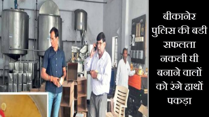 जयपुर। पुलिस ने बीकानेर में नकली देशी घी बनाने की फैक्ट्री पकड़ी है। इस फैक्ट्री से राज्य के अन्य जिलों में बड़े पैमाने पर नकली घी सप्लाई किया जाता था। एसपी सवाईसिंह गोदारा ने बताया कि मंगलवार को सुबह बीछवाल थाना पुलिस ने पिकअप गाड़ी रोककर उसकी तलाशी ली तो उसमें नकली देशी घी के 100 टिन और अलग-अलग साइज के डिब्बों से भरे 40 कार्टून बरामद हुए। गाड़ी चालक से पूछताछ की गई तो पता चला कि नाल एरिया में हाइवे पर टोल नाके के पास हाइटेक फैक्ट्री है जहां बड़े पैमाने पर नकली देशी घी बनाने का कारोबार किया जा रहा है। नाल और बीछवाल थाना पुलिस ने वहां छापा मारा तो हाईटेक तरीके से नकली देशी घी बनाया जा रहा था। वैभव रिपेकर नाम की इस फैक्ट्री को देशनोक निवासी अशोक उपाध्याय चला रहा था जो वर्तमान में गंगाशहर में रहता है। उसे व फैक्ट्री में काम कर रहे छह लोगों को हिरासत में लिया गया है।