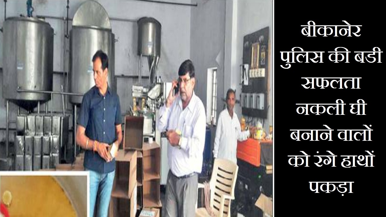 इनसे पूछताछ में सामने आया है कि फैक्ट्री में दो साल से नकली देशी घी बनाया जा रहा है। रोजाना तीन से चार हजार लीटर नकली घी टिन, डिब्बों और थैलियों में भरकर ट्रांसपोर्ट के जरिये श्रीगंगानगर, हनुमानगढ़, जैसलमेर, बाड़मेर, जालौर, जोधपुर सहित अन्य जिलों में सप्लाई किया जाता था। इन जिलों में भी पुलिस को इत्तला कर दी गई है। नकली घी का कारोबार करने वाले फैक्ट्री में ही घी की प्रमाणिकता के लिए होलमार्क भी देते थे। नाल, बीछवाल और गंगाशहर पुलिस थानों में अलग-अलग मुकदमे दर्ज किए गए हैं। पुलिस ने मौके पर सीएमएचओ देवेन्द्र चौधरी और उनकी टीम को भी बुलाया जिन्होंने सैंपल लिए। सीओ सदर राजेन्द्रसिंह राठौड़, नाल थाना एसएचओ जगदीश तंवर, बीछवाल थाना एसएचओ धीरेन्द्रसिंह कार्यवाही में शामिल थे। मौके से बरामद : एसेंस की एक बोतल जिससे दो ट्रक नकली घी बनाया जा सकता है। एक टिन घी में एसेंस की दो बूंद डाली जाती है। पैकिंग मशीनें, पाम ऑयल, डालडा घी, टिन, डिब्बे, थैलियां, होलमार्क, कलर, पैकिंग आदि का सामान जिसके नाम लाइसेंस था, उसे 8000 रुपए महीना देते थे पुलिस के मुताबिक नाल एरिया में नकली घी बनाने की फैक्ट्री का लाइसेंस दिनेश व्यास के नाम से लिया था और उसे तो हर माह केवल 8000 रुपए ही दिए जाते थे। फैक्ट्री का मालिक और नकली घी का कारोबार अशोक उपाध्याय करता था।