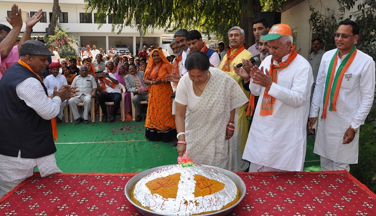 जयपुर। प्रदेश के विभिन्न क्षेत्रों से आए भाजपा अनुसूचित जनजाति मोर्चा के कार्यकर्ताओं ने राज्य सरकार द्वारा एसटी वर्ग सहित समाज के अन्य वर्गों के लिए की गई कल्याणकारी घोषणाओं के लिए मुख्यमंत्री वसुन्धरा राजे का सोमवार को मुख्यमंत्री निवास पर आभार व्यक्त किया। इन कार्यकर्ताओं ने श्रीमती राजे को पुष्पगुच्छ भेंट किए, चुनरी ओढ़ाई तथा मुख्यमंत्री को उनके जन्मदिवस (8 मार्च) की अग्रिम बधाई देते हुए 65 किलो का केक भी काटा।