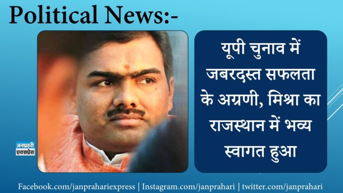 जयपुर। आठ साल बाद भाजपा के संगठन महामंत्री चन्द्रशेखर मिश्रा बुधवार को जयपुर पहुंचे। सांगानेर एयरपोर्ट पर प्रदेश अध्यक्ष अशोक परनामी समेत दूसरे नेताओं व कार्यकर्ताओं ने अभिनंदन किया। पार्टी कार्यालय में आने पर उनका स्वागत किया गया।