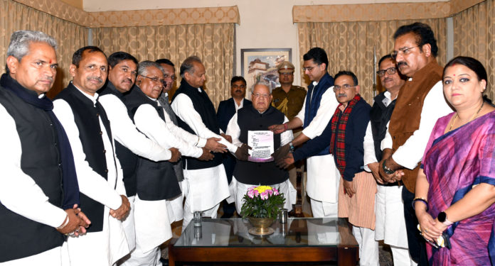 जयपुर। राज्यपाल कलराज मिश्र को रविवार को यहां राजभवन में मुख्यमंत्री अशोक गहलोत ने राष्ट्रपति के नाम ज्ञापन प्रस्तुत किया। इस मौके पर उपमुख्यमंत्री सचिन पायलट सहित मंत्रिमंडल के सदस्यगण मौजूद थे।