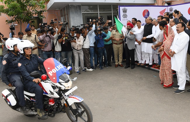 जयपुर। मुख्यमंत्री अशोक गहलोत ने मंगलवार को मुख्यमंत्री निवास से निर्भया स्कवॉड में शामिल 20 मोटरसाइकिल सवार महिला पुलिसकर्मियों को हरी झंडी दिखाकर रवाना किया। इस स्कवॉड में शामिल नीली वर्दी पहने प्रशिक्षित महिला पुलिसकर्मी जयपुर शहर के स्कूल, कॉलेज, मॉल्स, सार्वजनिक पार्क, बस स्टॉप जैसे चिन्हित स्थानों पर महिलाओं एवं बालिकाओं विशेषकर छात्राओं से छेड़छाड़ की घटनाओं को रोकने तथा उन्हें सुरक्षा प्रदान करने का कार्य करेंगी।