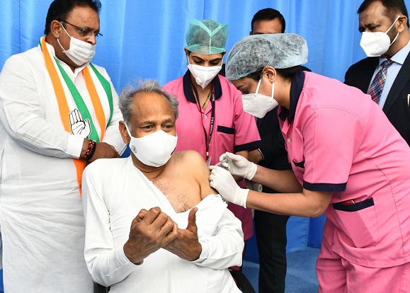 जयपुर। मुख्यमंत्री अशोक गहलोत ने शुक्रवार को सवाई मानसिंह अस्पताल के आईडीएच सेंटर पहुंचकर कोविड-19 वैक्सीन की पहली डोज लगवाई। मुख्यमंत्री के साथ चिकित्सा मंत्री डॉ. रघु शर्मा ने भी टीका लगवाया।