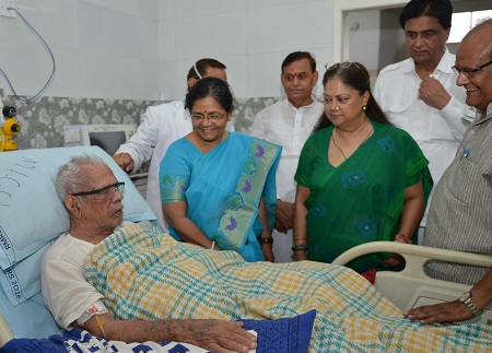जयपुर। मुख्यमंत्री वसुन्धरा राजे ने मंगलवार को एसएमएस अस्पताल के मेडिकल आईसीयू में भर्ती पूर्व मंत्री भंवर लाल शर्मा से मुलाकात की और उनकी कुशलक्षेम पूछी। राजे ने चिकित्सकों से उनके स्वास्थ्य के बारे में जानकारी ली।