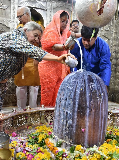 उज्जैन। मुख्यमंत्री वसुन्धरा राजे ने गुरूवार को उज्जैन के श्री महाकालेश्वर मन्दिर में देवदर्शन कर विधिवत पूजा-अर्चना की। उन्होंने कालभैरव मन्दिर, अंगारेश्वर मन्दिर, हरसिद्धि माता मन्दिर में भी पूजा की और दर्शन कर प्रदेश में शांति एवं खुशहाली की कामना की। राजे ने सर्वप्रथम भैरवगढ़ स्थित कालभैरव मन्दिर में दर्शन कर पूजा-अर्चना की। इसके बाद उन्होंने मंगलनाथ स्थित श्री अंगारेश्वर, हरसिद्धि माता मन्दिर में पूजा की। मुख्यमंत्री बाद में श्री महाकालेश्वर मन्दिर पहुंचीं तथा भगवान महाकाल के दर्शन एवं पूजा की। इस दौरान सांसद दुष्यन्त सिंह भी साथ थे।