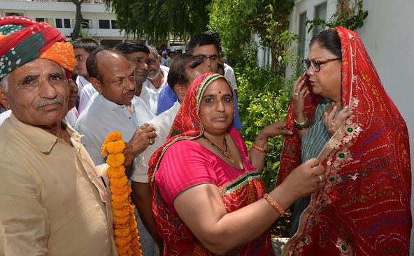 जयपुर। मुख्यमंत्री वसुन्धरा राजे से बुधवार को मुख्यमंत्री निवास पर भदाल, दादिया, लूणियावास, रलावता, इटावा व कोटड़ी आदि गांवों के लोगों ने मुलाकात की तथा भदाल से दादिया के बीच सड़क निर्माण की घोषणा के लिए उनका आभार व्यक्त किया। बड़ी संख्या में आए इन लोगों ने राजे को चुनरी ओढाई और माला पहनाई।