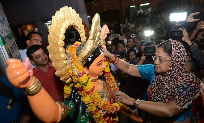 जयपुर। मुख्यमंत्री वसुन्धरा राजे ने धनतेरस पर मंगलवार को शहर के विभिन्न स्थानों पर की गई दीवाली की रोशनी का स्विच आॅन कर शुभारम्भ किया और माँ लक्ष्मी की पूजा अर्चना कर प्रदेश में खुशहाली एवं समृद्धि की कामना की। राजे सबसे पहले जौहरी बाजार पहुंची जहां व्यापार मण्डल के पदाधिकारियों ने उनका स्वागत किया। उन्होंने वहां पूजा भी की। इसके बाद वे त्रिपोलिया बाजार, छोटी चैपड़, किशनपोल बाजार तथा अंत में एमआई रोड बाजार गईं। मुख्यमंत्री ने सभी जगहों पर व्यापार मण्डलों द्वारा की गई आकर्षक रोशनी एवं सजावट का स्विच आॅन कर शुभारम्भ किया।
