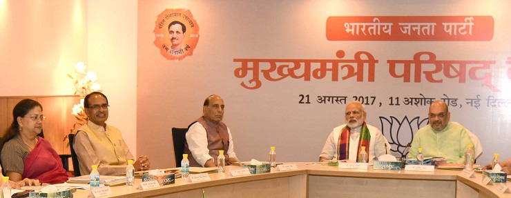 जयपुर। मुख्यमंत्री वसुन्धरा राजे सोमवार को प्रधानमंत्री नरेन्द्र मोदी की अध्यक्षता में अशोक रोड स्थित भाजपा के राष्ट्रीय मुख्यालय में आयोजित पार्टी की मुख्यमंत्री परिषद की बैठक में सम्मिलित हुईं। बैठक में प्रधानमंत्री ने पार्टी अध्यक्ष अमित शाह की उपस्थिति में राज्यों की बेहतर योजनाओं के साथ-साथ केन्द्रीय योजनाओं की प्रगति की समीक्षा की। बैठक में गृहमंत्री राजनाथ सिंह, विदेश मंत्री सुषमा स्वराज, पार्टी के राष्ट्रीय महामंत्री रामलाल, मध्यप्रदेश, गुजरात, महाराष्ट्र, छत्तीसगढ़, उत्तर प्रदेश सहित विभिन्न भाजपा शासित राज्यों के मुख्यमंत्रियों एवं उपमुख्यमंत्रियों ने हिस्सा लिया।