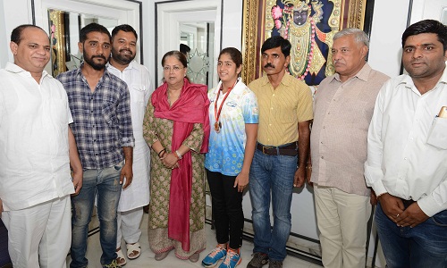 जयपुर। मुख्यमंत्री वसुन्धरा राजे से बुधवार को मुख्यमंत्री निवास पर राष्ट्रीय जूनियर स्विमिंग काॅम्पीटिशन की स्वर्ण पदक विजेता फिरदौस कायमखानी ने मुलाकात की।