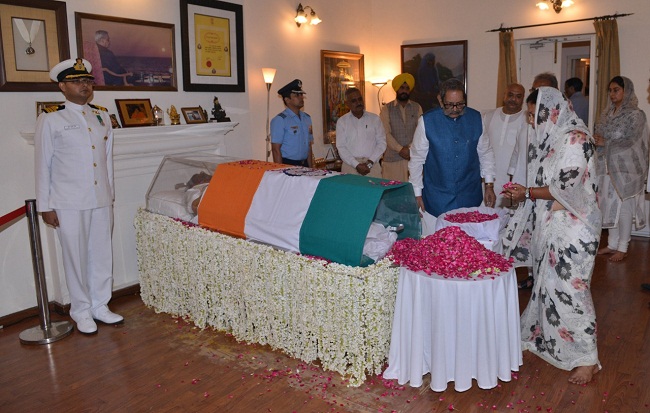 जयपुर। मुख्यमंत्री वसुन्धरा राजे ने गुरुवार शाम को पूर्व प्रधानमंत्री अटल बिहारी वाजपेयी के 6 ए कृष्णा मेनन मार्ग स्थित राजकीय निवास पहुँच कर उनके पार्थिव शरीर पर श्रद्धा सुमन अर्पित किए। राजे ने स्व. वाजपेयी के परिवार जनों से मिल कर उन्हें ढांढस बंधाया।