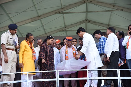मुख्यमंत्री राजे आज शाम 4 बजे सभा स्थल के पास बनाये गये अस्थायी हेलीपेड पर जयपुर से हेलीकॉपटर द्वारा पहंुची, जहां मुख्यमंत्री का भाजपा के प्रदेश प्रभारी व राष्ट्रीय उपाध्यक्ष अविनाश राय खन्ना, प्रदेशाध्यक्ष मदनलाल सेनी, राज्यसभा सांसद नारायण लाल पंचारिया, केबिनेट मंत्री युनूस खान, मंत्री वासुदेव देवनानी, अनिता भदेल, ओकांर सिंह लखावत, जिला प्रमुख वंदना नोगिया, महापौर धर्मेन्द्र गहलोत, एडीए अध्यक्ष शिवशंकर हेड़ा, शहर अध्यक्ष अरविन्द यादव व देहात अध्यक्ष बीपी सारस्वत, पूर्णांशकर दशोरा सहित स्थानीय भाजपा नेताओं ने मुख्यमंत्री की अगुवानी कर स्वागत किया। मुख्यमंत्री ने सभी के साथ मिलकर सभा स्थल की व्यवस्थाओं का जायजा लिया। इससे पूर्व मुख्यमंत्री ने हेलीकॉपटर से दो राउण्ड लगाकर सभा स्थल का निरीक्षण किया।