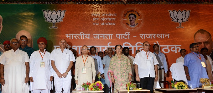 बैठक में प्रदेश सह प्रभारी गोपाल शेट्टी, पार्टी प्रदेशाध्यक्ष अशोक परनामी एवं गृहमंत्री गुलाब चन्द कटारिया सहित केन्द्रीय मंत्रीगण, राज्य मंत्री परिषद् के अन्य सदस्य, सांसद, विधायक, पार्टी पदाधिकारी एवं प्रमुख कार्यकर्ता मौजूद थे।