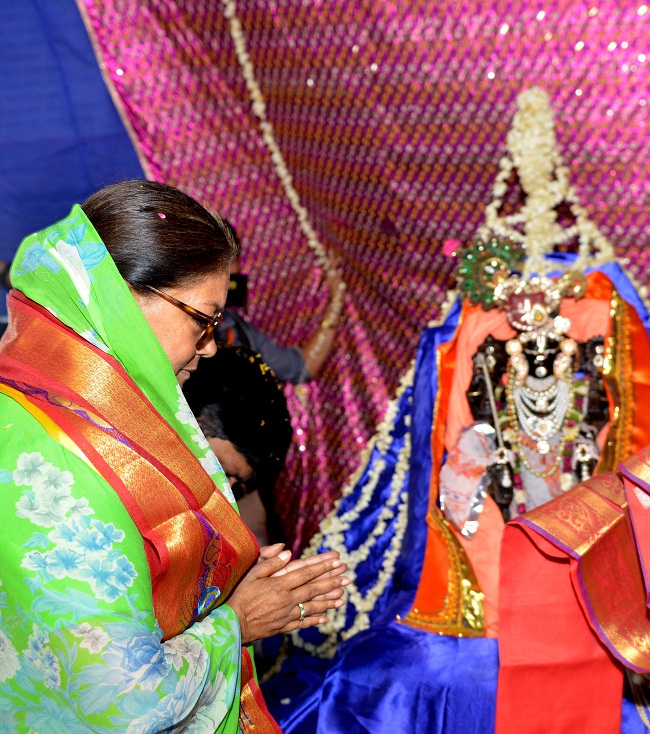 जयपुर। मुख्यमंत्री वसुन्धरा राजे ने झालरापाटन के श्री द्वारकाधीश जी मंदिर में दर्शन किए। राजे ने भगवान श्री द्वारकाधीश से प्रदेश की उन्नति, समृद्धि और खुशहाली की कामना की। श्रीमती राजे का मंदिर प्रबन्धन समिति ने दुपट्टा ओढ़ाकर एवं अभिनन्दन पत्र भेंटकर स्वागत किया। वहीं आरएसी बैंड ने स्वर लहरियों से मुख्यमंत्री की अगवानी की। इस अवसर पर सांसद दुष्यंत सिंह भी उपस्थित थे।