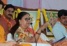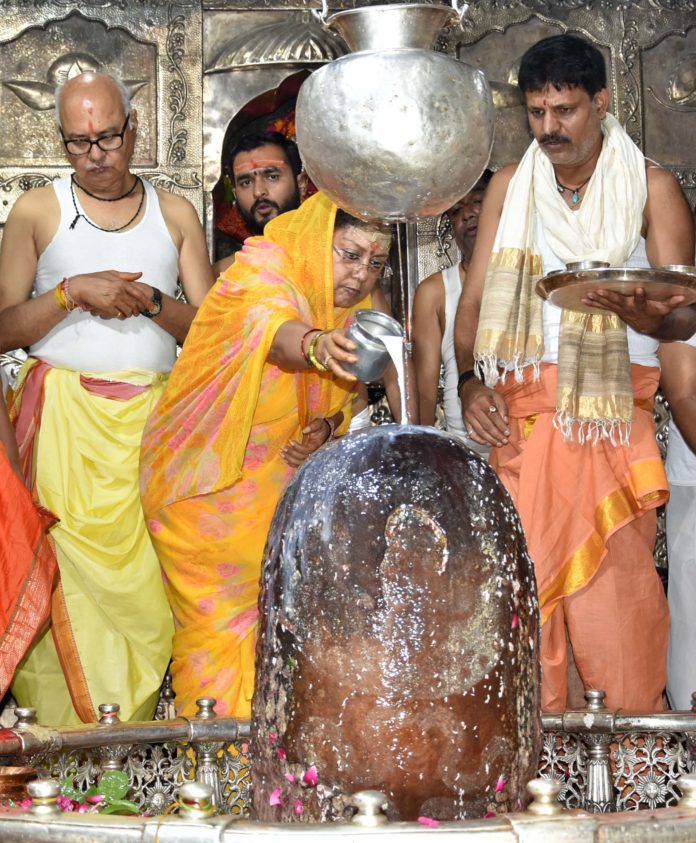 उज्जैन। मुख्यमंत्री वसुन्धरा राजे ने गुरुवार को उज्जैन में श्री महाकालेश्वर मंदिर में भगवान महाकाल के दर्शन कर पूजा-अर्चना की तथा प्रदेश की उन्नति और खुशहाली की कामना की। मुख्यमंत्री को यहां नंदी हॉल में प्रशासक क्षितिज शर्मा ने भगवान महाकाल के आशीर्वाद स्वरूप प्रसाद एवं दुपट्टा भेंट किया तथा मंदिर के पुजारी संजय शर्मा ने पूजा सम्पन्न करवाई।