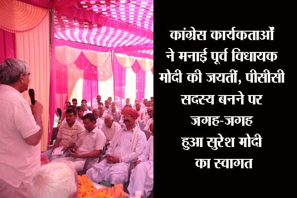 नीमकाथाना। हाल ही में राजस्थान प्रदेश कांग्रेस कमेटी में कि गई नियुक्तीयों में नीमकाथाना विधानसभा क्षेत्र के पाटन ब्लाक से कांग्रेस नेता सुरेश मोदी को पीसीसी सदस्य बनाया गया है। मोदी के पीसीसी सदस्य बनने बाद गुरूवार को चला, सिरोही एवं उनके छावनी स्थित आवास पर सैकड़ो कांग्रेस कार्यकताओं द्वारा साफा एवं माला पहना स्वागत किया गया। स्वागत कार्यक्रम को सेवादल के मदनलाल आड़तिया ने संचालित किया। कार्यक्रम के दौरान कई वरिष्ठ कांग्रेस कार्यकतार्ओं ने अपने-अपने विचार रखें।