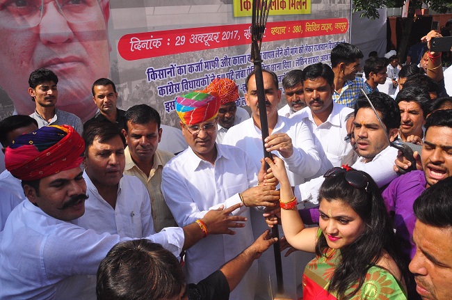 जयपुर। प्रदेश के लाखों किसानों का संपूर्ण कर्जा माफ कराने के लिए कांग्रेस गांव-ढाणी तक जनजागरण कर राज्य की भाजपा सरकार पर दबाव बनायेगी। इसके साथ ही सरकार को उसके जनविरोधी फैसलों पर घेरेगी। यह एलान आज राजस्थान विधानसभा के नेता प्रतिपक्ष रामेश्वर डूडी ने यहां अपने सरकारी निवास पर आयोजित ’किसान लोक मिलन’ कार्यक्रम में प्रदेष भर से आये किसानों एवं कांग्रेसजनों के समक्ष किया। किसानों ने डूडी को आलू, प्याज, भिंडी की मालाएं पहनाई और पालक का साफा पहनाया। डूडी को किसानों ने दर्जन भर से ज्यादा हल व दातंली भी भेंट की।