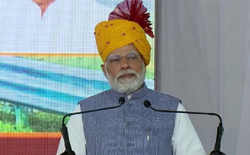 -दिल्ली-मुंबई एक्सप्रेस-वे के उद्घाटन कार्यक्रम में प्रधानमंत्री नरेंद्र मोदी को पारंपरिक राजस्थानी पगड़ी पहनाई