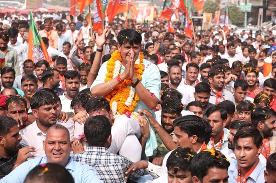 – अनेक जगहों पर भाजपा उम्मीदवार रामलाल शर्मा का किया स्वागत, जेसीबी से बरसाए फूल।