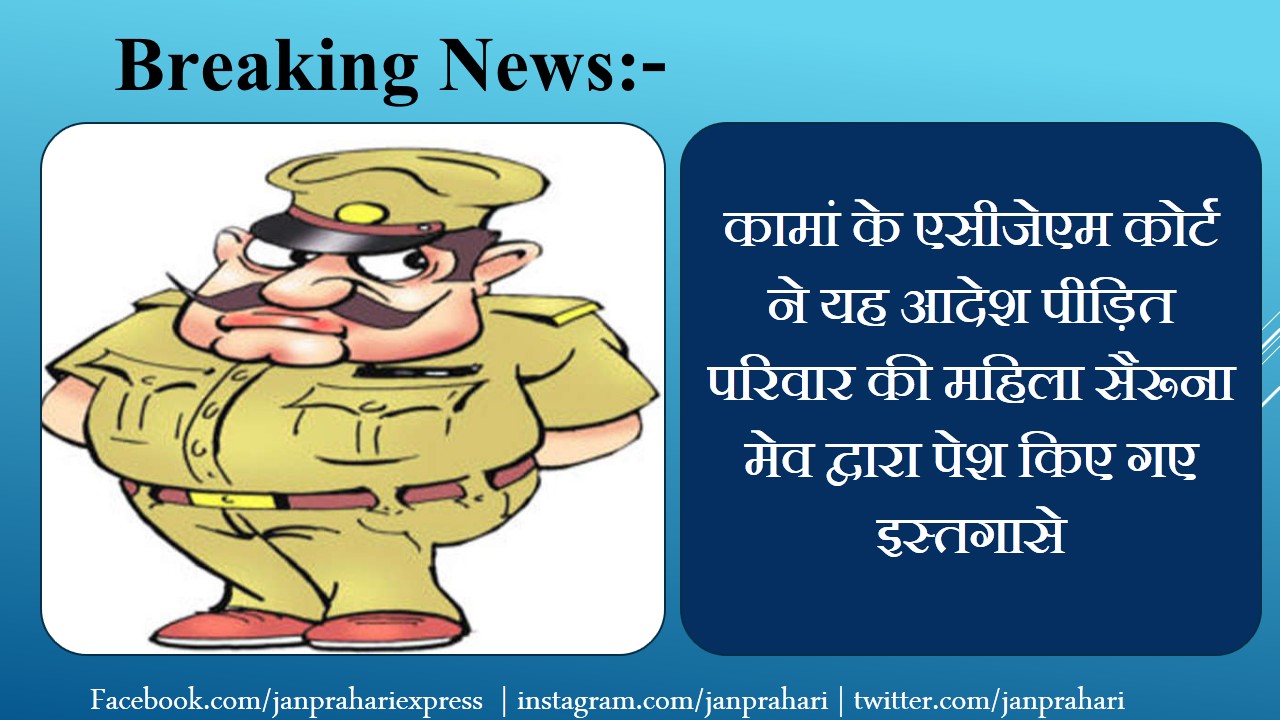 कामां। भरतपुर जिले में कामां थाना क्षेत्र के गांव विरार में पुलिस दबिश के दौरान नवजात बालक की संदिग्ध परिस्थितियों में मौत के मामले में डीएसपी दो एसएचओ सहित करीब 50 पुलिसकर्मियों पर केस दर्ज होगा। कामां के एसीजेएम कोर्ट ने यह आदेश पीड़ित परिवार की महिला सैरूना मेव द्वारा पेश किए गए इस्तगासे पर दिए हैं। महिला का आरोप है कि 10 जुलाई को वह अपने नवजात बच्चे के साथ घर पर लेटी हुई थी, तभी कामां डीएसपी रायसिंह बेनीवाल, जुरहरा के तत्कालीन एसएचओ योगेंद्र सिंह, कामां एसएचओ राकेश यादव, कांस्टेबल इमरान बनै सिंह सहित 40-50 पुलिसकर्मियों ने घर का घेराव किया। इस बीच इमरान और अन्य पुलिसकर्मी जबरन घर में घुसे और मेरी खाट पर चढ़ गए। इमरान के पैर के नीचे दबने से बच्चे की मौत हो गई। कोर्ट ने मामला दर्ज कर एसपी या एएसपी स्तर के अधिकारी से जांच कराने के आदेश दिए। मामले में कामां सीओ रायसिंह बेनीवाल ने कहा कि महिला के आरोप झूठे और निराधार हैं। बालक की मौत पुलिस की दबिश से पहले ही हो चुकी थी। पोस्टमार्टम रिपोर्ट में भी यह बात साबित हो चुकी है।