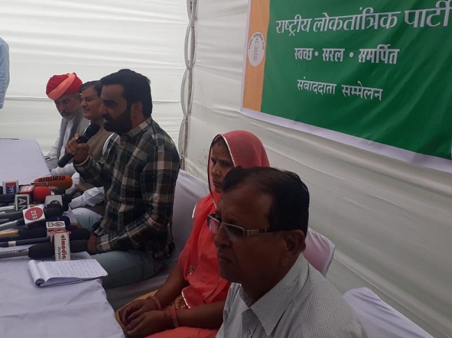 Jaipur. राष्ट्रीय लोकतांत्रिक पार्टी संयोजक व खिंवसर विधायक हनुमान बेनीवाल ने आगामी लोकसभा चुनाव मे पार्टी की भूमिका सहित विभिन्न मुद्दो पर अपनी बात मीडिया के समक्ष रखी| बेनीवाल ने प्रेस वार्ता को संबोधित करते हुए कहा की किसानो की कर्ज़ माफी , बेरोज़गारी की समस्या का समाधान व अपराध पर लगाम लगाने, स्वामीनाथन आयोग की सिफारिशे लागू करवाने सहित दर्जनो जनहित के मुद्दो को लेकर जन आंदोलन किया उसके बाद नये राजनीतिक दल का गठन किया और मात्र 57 सीटो पर चुनाव लड़ने के बावजूद रालोपा ने 8 लाख से अधिक मत हासिल किए और 3 विधायक जीतकर आए वही 2 प्रत्यासी दूसरे नंबर पर रहे|