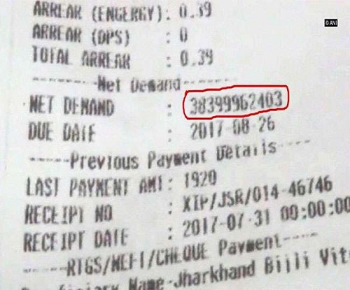नई दिल्ली। सरकारी महकमों के कारिंदे अपने कार्य के प्रति किस कदर लापरवाह इसकी उदाहरण झारखंड के जमशेदपुर में देखने को मिला। जहां विद्युत विभाग ने जमशेदपुर के एक स्थानीय विद्युत उपभोक्ता बीआर गुहा को विद्युत उपभोग के एवज में बिजली का बिल कुछ सौ या हजार रुपयों का नहीं पूरे 38 अरब रुपए का बिल थमा दिया।