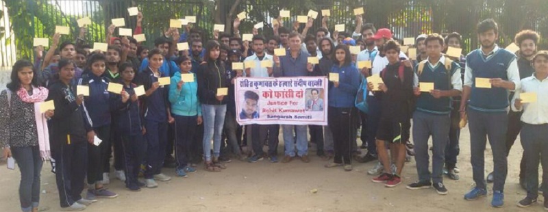 जयपुर। जयपुर नेशनल यूनिर्वसिटी के मालिक संदीप बख्शी के फार्म हाऊस के सुरक्षा गार्डों की ओर से की गई गोलीबारी में मारे गए इंजीनियर छात्र रोहित कुमावत व अन्य गंभीर घायल दो छात्रों को न्याय दिलाने के लिए जयपुर के इंजीनियरिंग कॉलेजों के छात्र-छात्राएं लामबंद होने लगे हैं। इस गोलीकाण्ड में आरोपी दूसरे सुरक्षा गार्ड की गिरफ्तारी और मृतक रोहित व घायल छात्रों को उचित मुआवजा दिलाने की मांग को लेकर हाल ही शहीद स्मारक पर सैकड़ों छात्रों ने धरना-प्रदर्शन दिया था। पुलिस कमिश्नर संजय अग्रवाल के नाम डीसीपी क्राइम विकास पाठक को ज्ञापन दिया गया था। इसके बाद भी दूसरे सुरक्षा गार्ड की गिरफ्तारी नहीं होने और मामले में लीपापोती के आरोप लगाते हुए अब छात्रों ने न्याय के लिए राष्ट्रपति प्रणव मुखर्जी, प्रधानमंत्री नरेन्द्र मोदी, सुप्रीम कोर्ट के मुख्य न्यायाधीश, राजस्थान हाईकोर्ट के मुख्य न्यायाधीश को पत्र लिखने शुरु कर दिए हैं। मंगलवार और बुधवार को करीब ढाई हजार से अधिक पोस्टकार्ड भिजवाकर न्याय दिलाने की गुहार की है। पत्रों में यह भी कहा है कि रसूखदार आरोपी के चलते राजस्थान सरकार और जयपुर पुलिस मामले को दबाने में लगी हुई है, जबकि इस मामले में इंजीनियरिंग छात्रों और कुमावत समाज में जबरदस्त रोष है। इस हत्याकाण्ड को लेकर भीलवाड़ा, सीकर, जयपुर आदि जिलों में कुमावत समाज धरने-प्रदर्शन कर भी चुका है। जस्टिस फोर रोहित कुमावत संघर्ष समिति के संयोजक पंकज शर्मा काकू का आरोप है कि पुलिस आयुक्त को ज्ञापन देने के बाद भी पुलिस ने इस मामले को अभी तक उच्च पुलिस अधिकारी के पास अनुसंधान के लिए स्थानांतरित नहीं किया है और ना ही दूसरे सुरक्षा गार्ड की गिरफ्तारी की गई है। जयपुर पुलिस व सरकार की इस लापरवारी और न्याय के लिए छात्रों ने प्रेसीडेंट-पीएम और सर्वोच्च न्यायालय- हाईकोर्ट राजस्थान के मुख्य न्यायाधीश को पोस्ट कार्ड भेजो अभियान शुरु किया है। दो दिन में ढाई हजार पोस्टकार्ड भिजवा दिए हैं।