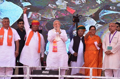 वसुन्धरा राजे ने कहा कि इस उद्देश्य से मैं ये घोषणा करती हूं कि ग्रामीण क्षेत्र के सामान्य श्रेणी कनेक्शन वाले सभी किसानों को निश्चित सीमा तक मुफ्त बिजली दी जाएगी। इसके आदेश हमने कल ही निकाल दिए। ये किसानों की आय को दुगुना करने की दिशा में एक ऐतिहासिक कदम है। प्रधानमंत्री, मैं आपको धन्यवाद देना चाहती हूं कि आपने आम लोगों की पीड़ा समझते हुए पेट्रोल-डीजल के दाम कम किये। हमने भी ट।ज् में 4ः की कमी करके प्रदेशवासियों को राहत दी। आज राज्य में पेट्रोल और डीजल करीब साढे़ 5 रू. सस्ता है। आपकी उज्ज्वला योजना में 37 लाख महिलाओं को मुफ्त गैस कनेक्शन मिले हैं। हमने पूरे प्रदेश को जल संकट से भी उबारने का प्रयास किया है। जहां पानी नहीं था, वहां हमने पीने का शुद्ध पानी पहुंचाया है। चाहे नागौर हो या भीलवाड़ा। या फिर बाड़मेर।