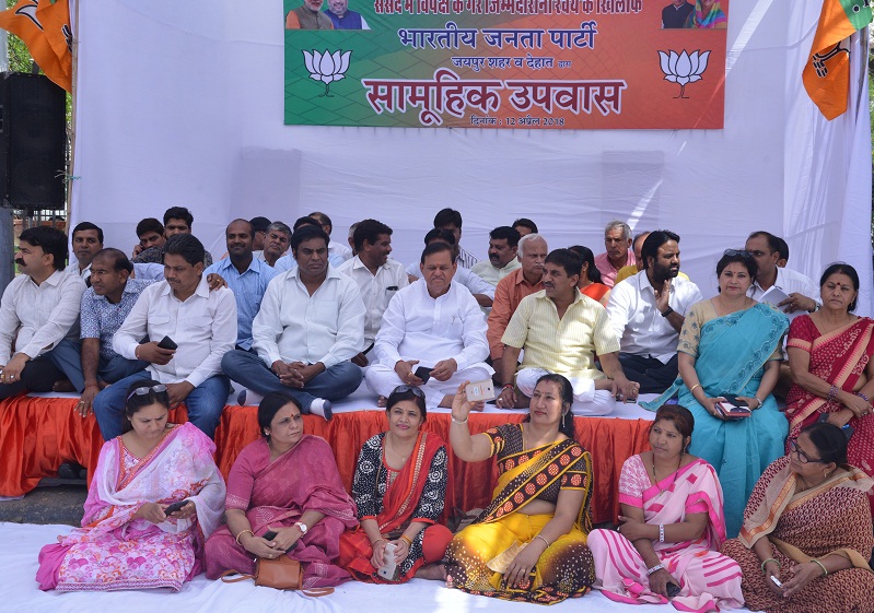 जयपुर में सांसद रामचरण बोहरा के नेतृत्व में उपवास रखा गया, जिसमें सुबह से ही भाजपा कार्यकर्ता उपवास पर बैठे। भाजपा जयपुर शहर अध्यक्ष संजय जैन, जयपुर देहात अध्यक्ष डीडी कुमावत, विधायक मोहन लाल गुप्ता, नरपत सिंह राजवी, सुरेन्द्र पारीक समेत अन्य विधायक, पार्षद व पार्टी पदाधिकारियों के साथ बड़ी संख्या में कार्यकर्ता दिन भर उपवास पर रहे। दोपहर में भाजपा प्रदेशाध्यक्ष अशोक परनामी उपवास स्थल पर पहुंचे। उन्होंने वहां मौजूद लोगों को संबोधित करते हुए कहा कि कांग्रेस विकास कार्यों में रोड अटकाकर देश के विकास को रोकने में लगी हुई है। संसद में हंगामा करके सत्र को चलने नहीं दिया। एक तरह से नकारात्मक माहौल खड़ा किया जा रहा है, जिसके जवाब में भाजपा ने उपवास रखकर जनता को कांग्रेस की विकास विरोधी नीतियों को सामने लाया जा रहा है।