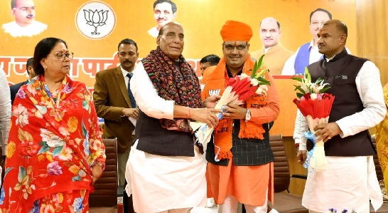 जयपुर. राजस्थान के नए मुख्यमंत्री का ऐलान हो गया है। सांगानेर से विधायक भजनलाल शर्मा को विधायक दल का नेता चुना गया है। प्रदेश कार्यालय में हुई विधायक दल की बैठक में भाजपा हाईकमान द्वारा तय किए गए नाम का ऐलान किया गया और उस नाम पर सभी की सहमति बन गई। नए मुख्यमंत्री के नाम का प्रस्ताव वसुंधरा राजे ने ही रखा। भजनलाल शर्मा संघ पृष्ठभूमि से आते हैं। वे मूलत: भरतपुर के रहने वाले हैं। वे प्रदेश महामंत्री के पद पर भी थे। विधायकों की ग्रुप फोटो में भजनलाल शर्मा चौथी लाइन में बैठे थे। इसके साथ ही दीया कुमारी और प्रेमचंद बैरवा उप मुख्यमंत्री होंगे। वहीं, अजमेर उत्तर से विधायक वासुदेव देवनानी विधानसभा स्पीकर होंगे। भाजपा ने तीनों बड़े पद जयपुर को ही दिए हैं। भजनलाल शर्मा जयपुर की सांगानेर सीट से विधायक हैं। वहीं, दीया कुमारी जयपुर की विद्याधर नगर सीट से जीती हैं तो प्रेमचंद बैरवा जयपुर जिले की दूदू सीट से विधायक हैं। विधायक दल की बैठक के बाद भजनलाल शर्मा सहित सभी भाजपा नेता राजभवन पहुंचे। यहां उन्होंने राज्यपाल से मिलकर सरकार बनाने का दावा पेश किया। राज्यपाल ने भाजपा को सरकार बनाने का न्यौता दिया है। 15 दिसंबर को नई सरकार का शपथ ग्रहण हो सकता है। 15 दिसंबर को ही भजनलाल शर्मा का जन्मदिन भी है। विधायक दल का नेता चुने जाने के बाद भजनलाल शर्मा ने कहा कि भाजपा के सभी नेताओं के साथ मिलकर राजस्थान का सर्वांगीण विकास करेंगे। भजनलाल शर्मा को सांगानेर से विधायक अशोक लाहोटी का टिकट काटकर उतारा गया था। प्रदेश मुख्यालय में बैठक से पहले राजनाथ के साथ सभी विधायकों का ग्रुप फोटो सेशन हुआ है। फोटो सेशन के दौरान वसुंधरा राजे रक्षा मंत्री राजनाथ सिंह के बिल्कुल बगल में बैठे थे। वहीं भजनलाल शर्मा चौथी पंक्ति में बैठे थे। दीया कुमारी दूसरी पंक्ति में थीं। राजनाथ सिंह नए मुख्यमंत्री का नाम लेकर आए। बैठक से पहले उन्हाेंने होटल में पूर्व मुख्यमंत्री वसुंधरा राजे से वन-टु-वन बातचीत की। दोनों के बीच करीब 10 मिनट तक बातचीत चली। इसके बाद सभी नेताओं के बीच भी कुछ देर चर्चा हुई। सूत्राें के मुताबिक राजनाथ सिंह ने होटल में ही वसुंधरा को बता दिया था कि उन्हें राजस्थान का नया मुख्यमंत्री नहीं बनाया जा रहा है, हालांकि नए सीएम का नाम की जानकारी उन्हें विधायक दल की बैठक से ऐन पहले ही दी गई। भाजपा ने मुख्यमंत्री और उप मुख्यमंत्री के चयन के जरिए ब्राह्मण, राजपूत और दलित कार्ड खेला है। ब्राह्मण को मुख्यमंत्री और राजपूत को उप मुख्यमंत्री बनाकर सामान्य वर्ग में भी भाजपा ने एक बड़ा मैसेज दिया है। वहीं प्रेमचंद बैरवा को उप मुख्यमंत्री बनाकर दलित कार्ड भी खेला है।