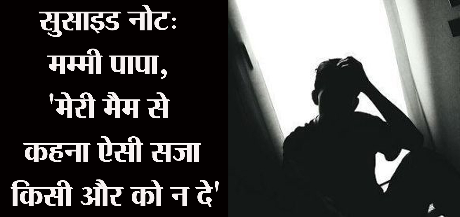 ये सुसाइड नोट गोरखपुर में पांचवीं में पढ़ने वाले छात्र का है। 15 सितम्?बर को उसने जहर खा लिया था। छात्र को मेडिकल कालेज में भर्ती कराया गया जहां बुधवार की शाम को उसकी मौत हो गई। छात्र के स्टडी टेबल से एक सुसाइड नोट मिला है जिसमें उसने स्कूल टीचर को मौत के लिए जिम्मेदार बताया है। सुसाइड नोट मिलने के बाद स्कूल पहुंचने परिवारीजनों ने वहां तोड़फोड़ की। प्रधानाचार्य के साथ भी हाथापाई की। प्रधानाचार्य ने 100 नम्बर पर सूचना देकर पुलिस बुलाई। छात्र के पिता ने स्कूल प्रशासन व क्लास टीचर के खिलाफ तहरीर दी है। इंस्पेक्टर ने कहा है कि तहरीर मिली है जांच की जा रही है। शाहपुर के मोहनापुर निवासी रविप्रकाश बापू इंटर कालेज पीपीगंज में शिक्षक हैं। उनका इकलौता बेटा 12 साल का नवनीत प्रकाश शाहपुर स्थित सेन्ट एंथोनी स्कूल में पांचवी कक्षा में पढ़ता था। 15 सितंबर को उसने घर पर जहर खा लिया था। उस दिन पिता स्कूल गए थे। मां बाजार गई थी। घर पर अकेले नवनीत ही था। बाजार से जब मां लौटी और बेटे को देखा तो चीख पड़ी उसके मुंह से झाग निकल रहा था वह तड़प रहा था। मां की चीख सुनकर पहुंचे कालोनी के लोगों ने नवनीत को बाबा राघव दास मेडिकल कॉलेज भर्ती कराया। उपचार के दौरान बुधवार को नवनीत ने दम तोड़ दिया। स्टडी टेबल पर मिली मौत की चिट्ठी, नवनीत की मौत के बाद परिवारीजनों ने उसके बैग और नोट बुक आदि की छानबीन की तो स्टडी टेबल पर एक सुसाइड नोट मिला, उसे पढ़कर मां-बाप सन्न रह गए। सुसाइड नोट से मौत की वजह सेंट एंथोनी स्कूल के क्लास टीचर को ठहराया गया था।