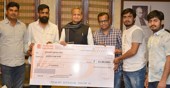 मुख्यमंत्री ने कहा कि इससे पहले कारगिल युद्ध में शहीद हुए जवानों एवं सुनामी से प्रभावित परिवारों की मदद के लिए आयोजित स्मृति चिन्ह नीलामी कार्यक्रम में लोगों ने खुले दिल से सहयोग किया था। गुजरात में आये भूकंप, कश्मीर में आई बाढ़ तथा हाल ही में केरल में आई बाढ़ से प्रभावित लोगों की मदद के लिए भी ऎसे कार्यक्रम आयोजित किए गए थे। मुख्यमंत्री अशोक गहलोत को स्पि्रंग बोर्ड एकेडमी कोचिंग संस्थान की ओर से शहीदों के परिवारों की मदद के लिए 21 लाख रूपये का चैक ‘सीएम रिलीफ फंड‘ के लिए भेंट किया गया। यह चैक स्पि्रंग बोर्ड एकेडमी की ओर से श्री विजय सिंह ने भेंट किया।