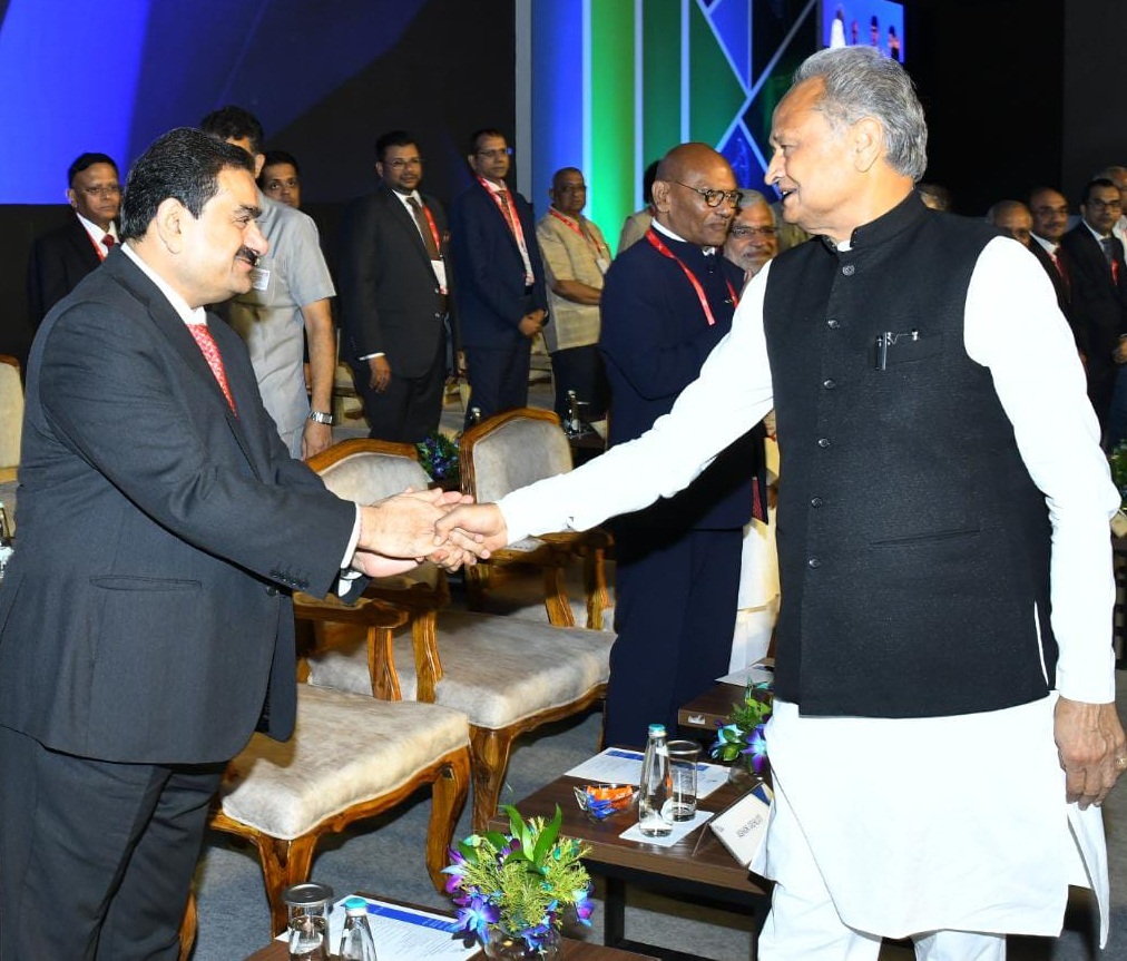 समिट के दौरान उद्योगपति गौतम अडाणी और मुख्यमंत्री अशोक गहलोत आस-पास बैठे। सीएम अशोक गहलोत से पहले अडाणी की स्पीच हुई, जिसमें अडाणी ने अशोक गहलोत सरकार के कार्यक्रमों और नीतियों की प्रशंसा करते हुए कहा कि राजस्थान में अशोक गहलोत अच्छा कार्य कर रही है। खासकर उड़ान, अनुप्रीति कोचिंग जैसी सामाजिक योजनाओं में। अडाणी ने यह कह कर भी गहलोत सरकार की प्रशंसा की कि पूरी दुनिया में उनकी कंपनी के प्रोजेक्ट सिर्फ राजस्थान में ही पूरे हुए हैं। गहलोत सरकार में पूरी पारदर्शिता से कार्य किया जा रहा है। यहीं कारण है कि वे अब 65 हजार करोड़ रुपये का निवेश राजस्थान में कर रहे हैं। अडाणी की स्पीच के बाद मुख्यमंत्री अशोक गहलोत ने समिट में आए सभी उद्योगपतियों का स्वागत किया और उन्हें निवेश के लिए अच्छा माहौल व सुविधाएँ देने की बात कही। गहलोत ने अडाणी को गौतम भाई कहते हुए दुनिया के दूसरे सबसे अमीर बिजनेसमैन बनने की बधाई दी। साथ ही गुजरात के उद्योगपतियों की भी प्रशंसा की।