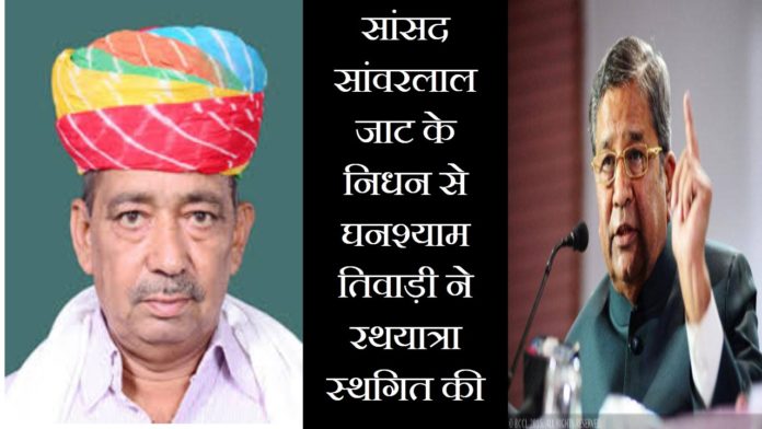 जयपुर। राजस्थान में नए राजनीतिक दल के गठन को लेकर निकलने वाली भाजपा के दिग्गज नेता और वरिष्ठ विधायक घनश्याम तिवाड़ी की लोक संग्रह अभियान की रथयात्रा आज बुधवार को स्थगित हो गई है। भाजपा के सांसद और पूर्व केन्द्रीय मंत्री प्रो.सांवर लाल जाट के बुधवार सुबह निधन की सूचना मिलने पर घनश्याम तिवाड़ी ने आज से प्रारंभ होने वाली रथयात्रा को स्थगित कर दिया। यह रथयात्रा सुबह नौ बजे अमर जवान ज्योति स्मारक पर शहीदों को श्रद्धांजलि देने के बाद निकलनी थी। तिवाड़ी बड़ी संख्या में कार्यकर्ताओं के साथ अमर जवान ज्योति स्मारक पहुंचे, वहां शहीदों को पुष्प अर्पित किए।