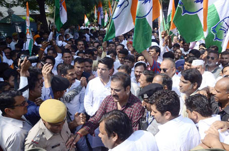 बड़ी तादाद में जयपुर के हजारों कांग्रेस कार्यकतार्ओं के एकत्रित होने से पुलिस महकमे में हडकम्प मचा हुआ था, सैकडों पुलिस वाले भी स्पेशल टास्क फोर्स के साथ मौके पर आ गये थे। कांग्रेस कार्यकतार्ओं के हजारों की तादाद में एकत्रित हो जाने से भाजपा कार्यालय का रास्ता जाम हो गया। इस दौरान कांग्रेस कार्यकतार्ओं के साथ सुबह 10 बजे से ही जिलाध्यक्ष प्रतापसिंह खाचरियावास चौमू हाउस सर्किल पर डटे हुये थे। सुबह 11 बजे सचिन पायलट के नेतृत्व में हजारों कांग्रेस कार्यकर्ता अविनाश पाण्डेय, प्रतापसिंह खाचरियावाास, विवेक बंसल के साथ जुलूस के रूप में सीबीआई आॅफिस के लिये नारे लगाते हुये रवाना हुये। कांग्रेस के जुलूस को बीच रास्ते में बेरिकेटिंग लगाकर बगडिया भवन चैराहा, सी-ह्यस्कीम पर रोक दिया। यहां पर पुलिस व कार्यकतार्ओं में थोडी-बहुत धक्का-मुक्की हुई।