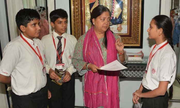 जयपुर। मुख्यमंत्री वसुन्धरा राजे से बुधवार को केम्ब्रिज कोर्ट हाई स्कूल की आठवीं कक्षा के विद्यार्थियों की एक टीम ने मुलाकात की। इस मुलाकात के दौरान छात्रों ने शहर की कुछ प्रमुख सड़कों को लेकर उनके द्वारा किए गए सर्वे की जानकारी दी। राजे को टीम लीडर अनन्या खण्डेलवाल के नेतृत्व में आए विद्यार्थियों ने जवाहर लाल नेहरू मार्ग एवं गोपालपुरा बाईपास सड़क के तुलनात्मक सर्वेक्षण के बारे में बताया। जेएलएन मार्ग की सड़क हरी-भरी, स्वच्छ, सुन्दर और सुव्यवस्थित है। उन्होंने मुख्यमंत्री से आग्रह किया कि स्मार्ट सिटी बनाने की दिशा में शहर की सभी सड़कें जेएलएन मार्ग की तर्ज पर विकसित हों और उन पर हरियाली और सौन्दर्यन कार्य हो। मुख्यमंत्री ने छोटे-छोटे बच्चों द्वारा किए गए इस सर्वे की प्रशंसा की। उन्होंने बच्चों से कहा कि सरकार सभी सड़कों को सुन्दर और हरियालीयुक्त बनाने का प्रयास कर रही है। आमजन और स्कूली बच्चे भी पौधारोपण कार्य में सरकार का सहयोग करें।
